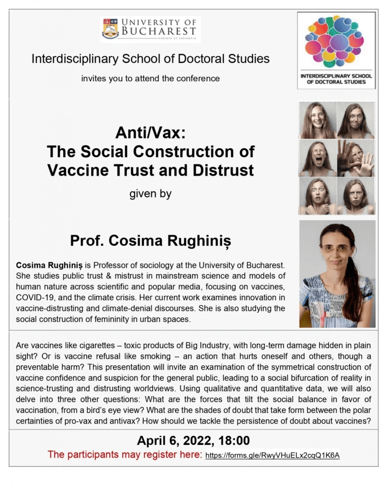 - Rughiniș, Cosima, April 6, 2022, Conference at the Interdisciplinary School of Doctoral Studies: “Anti/Vax: The Social Construction of Vaccination Trust and Distrust”. [Poster]