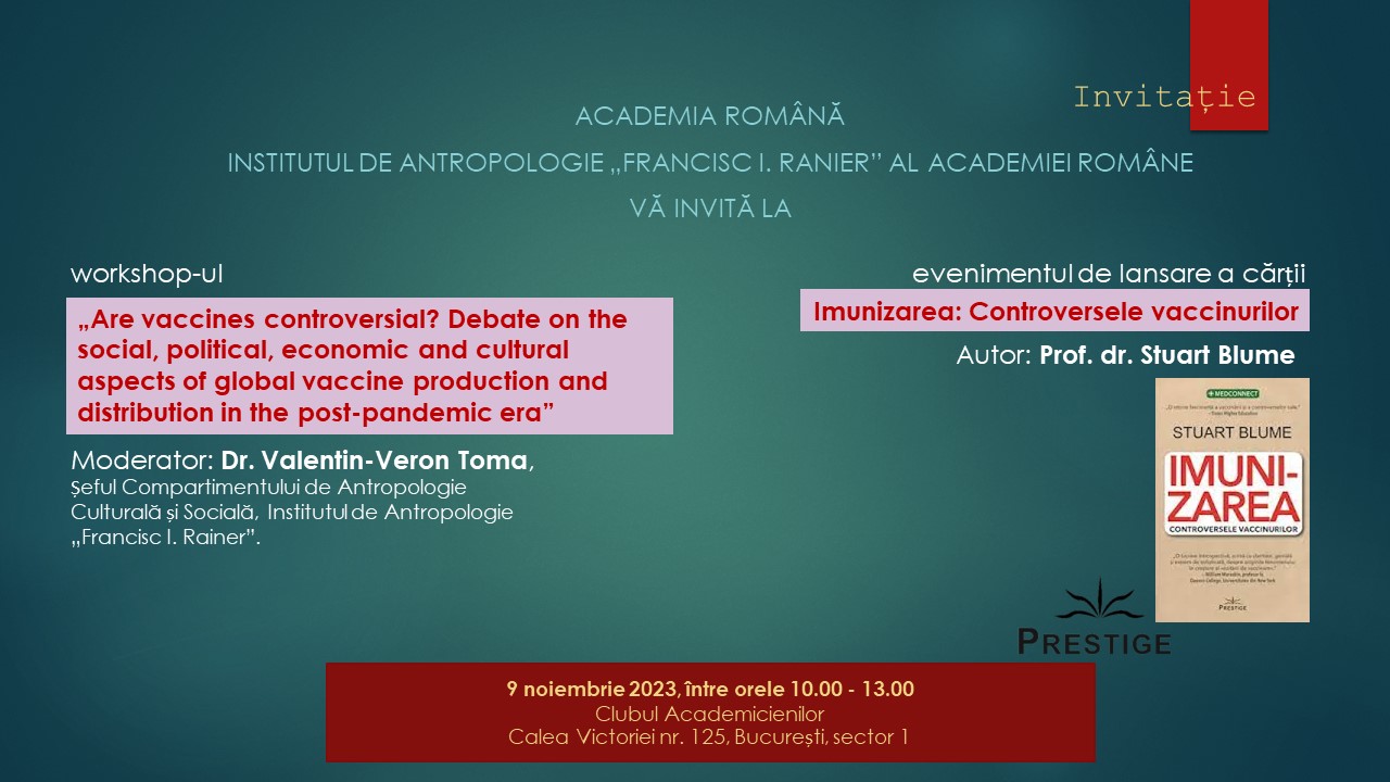 - Cosima Rughiniș, November 9, 2023, invited speaker at the Workshop „Are vaccines controversial? Debate on the social, political, economic and cultural aspects of global vaccine production and distribution in the post-pandemic era”, organized by “Francisc I. Rainer” Anthropology Institute, Romanian Academy.